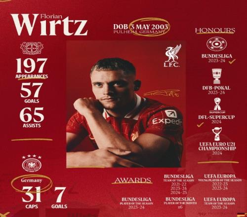 利物浦官推晒出了维尔茨职业生涯迄今为止的一些数据和荣誉。维尔茨共为勒沃库森出战197场比赛,打进57球并送出65次助攻。在国家队层面,他为德国出战31场比赛,有7球入账。