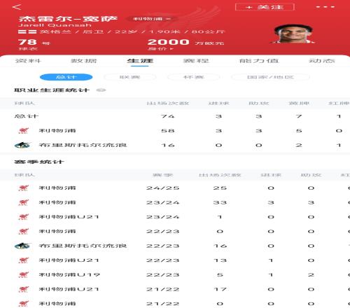 现年22岁的英格兰后卫宽萨是利物浦青训球员,本赛季代表利物浦在各项赛事中出场25次。他与俱乐部的合同2029年夏天到期,目前德转身价2000万欧元。