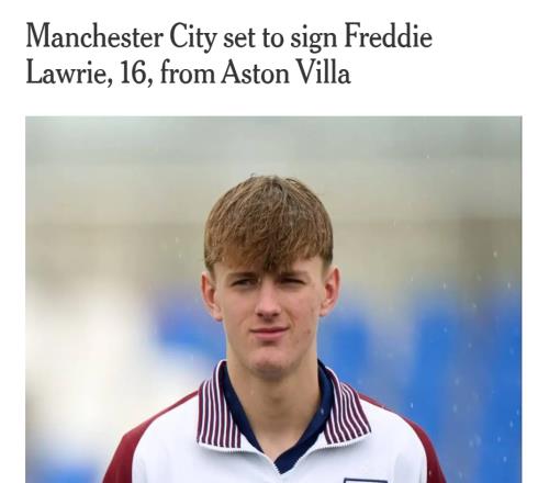 体育资讯6月19日报道宣称 The Athletic报道,曼城即将在弗雷迪-劳里的奖学金合同到期后,从阿斯顿维拉签下这位16岁新星以加强青训梯队。