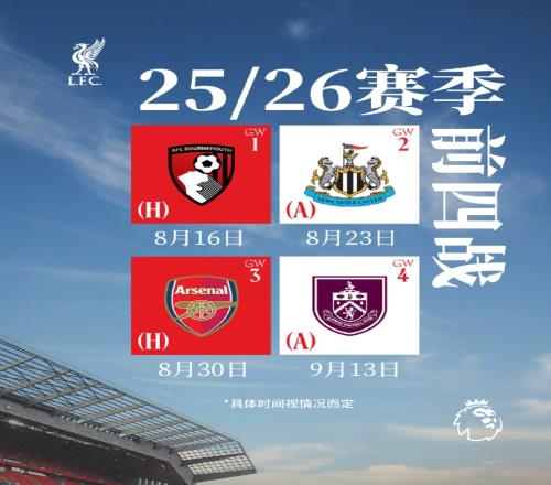 体育资讯06月18日报道宣称 25/26赛季英超赛程出炉,利物浦揭幕战对手是伯恩茅斯,比赛将于北京时间8月16日周六3:00进行,红军坐镇安菲尔德开启新赛季!
