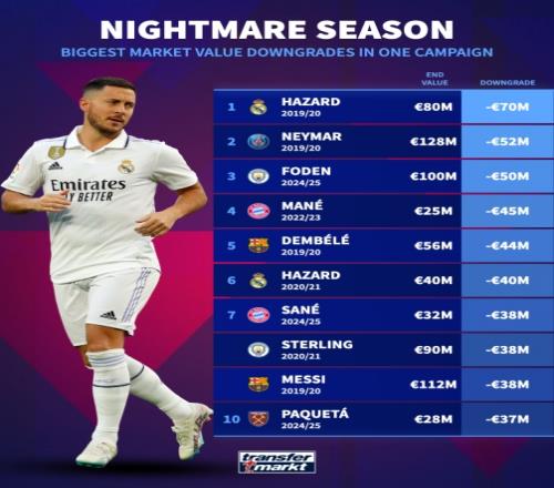 体育资讯06月17日报道宣称 德国转会市场统计了足坛历史上单赛季球员经历的最大身价下跌,并列出榜单,阿扎尔在这份尴尬的排行榜中居首,甚至两度上榜,内马尔、福登单赛季下跌达5000万分列二三,马内同样两度入榜,19/20赛季的梅西并列第七。