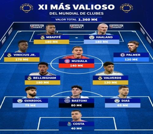 体育资讯6月17日报道宣称 新版世俱杯正在美国进行,德转列出世俱杯参赛队身价最贵阵,姆巴佩、哈兰德、贝林1.8亿欧并列第一,11人总身价13.6亿欧。