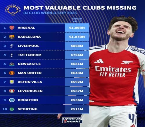 缺席世俱杯球队身价榜:阿森纳10.9亿欧居首,巴萨、利物浦二三位