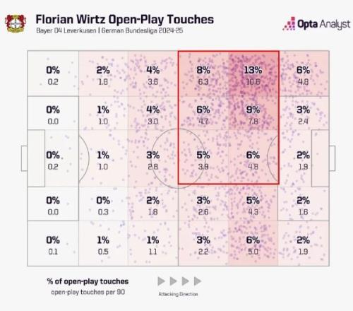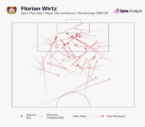 再加上他拉边后传中脚法好,硬仗时相比于射门得分,维尔茨可以尝试更多去跑位接应和传球。