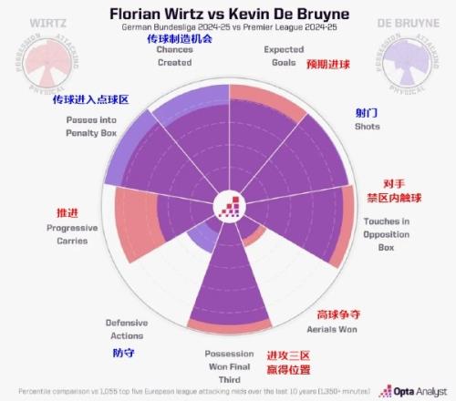 曼城之前相中维尔茨,应该是希望他能接班德布劳内。从统计数据对比可以看到,维尔茨在防守、射门和传球威胁方面与德布劳内还有差距。