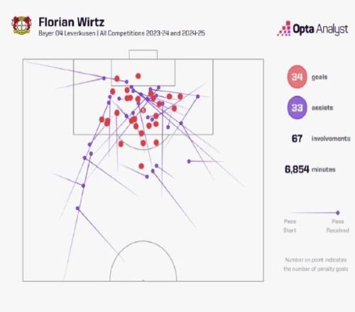 过去的2个赛季,维尔茨为勒沃库森贡献了34球33次助攻。这个数据不能说特别耀眼,也不算差。
