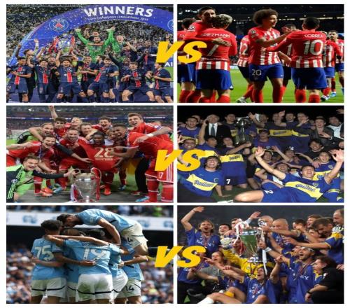 巴黎圣日耳曼(一排左)大战马德里竞技(一排右)、拜仁(二排左)迎战博卡青年(二排右)、曼城(三排左)对决尤文图斯(三排右)