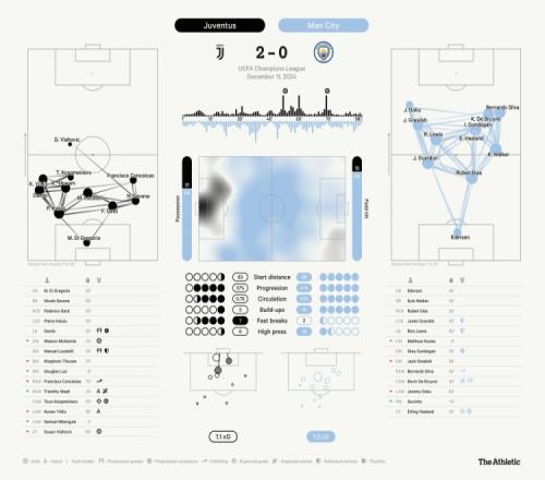 如下方的比赛数据面板所示,客队曼城掌控了球权和场上空间,通过边路配合将尤文图斯压制在后场。然而,尤文图斯在进攻端表现得更为锐利,两粒进球均源自传中球,曼城未能妥善防范。