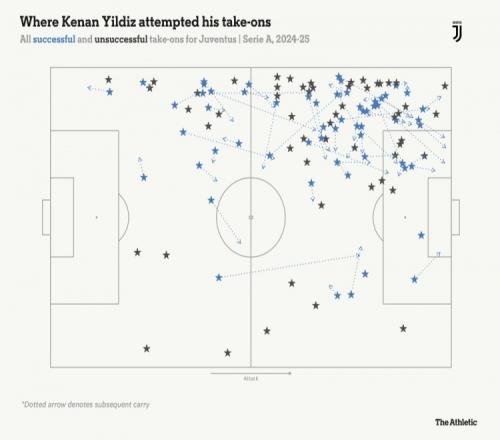 伊尔迪兹本赛季在意甲联赛中完成了113次突破过人,超过尤文图斯任何其他球员,并且他常常在过掉防守球员后持球向前推进。虽然他因在左路最具威胁而闻名,但其沉着镇定的心态和出色的平衡能力意味着他可以胜任进攻型中场的任何位置。