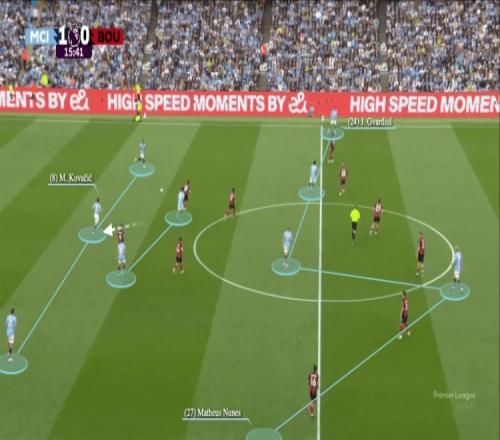 伤病问题是圣诞节前状态下滑的催化剂,但近几个月来,曼城已显现复苏的迹象。瓜迪奥拉通过调整战术体系,使边后卫在曼城进攻时能保持更靠前、更宽阔的站位。下图所示,即为他们在英超最后一个主场对阵伯恩茅斯时的场景,在组织进攻阶段,科瓦西奇回撤至防线,形成3-2-5阵型。