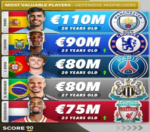 体育资讯6月13日报道宣称 2024-25赛季结束,Score 90更新了防守型中场的身价排行,其中,曼城中场罗德里1.1亿欧元排名第一,切尔西的凯塞多9000万欧元第二。