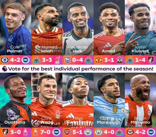 本赛季英超最佳个人表现奖候选:帕尔默、萨拉赫、伊萨克在列