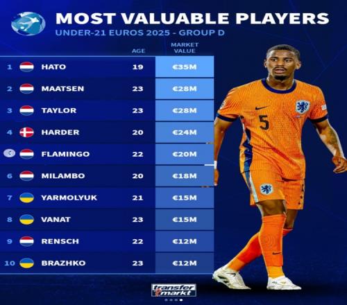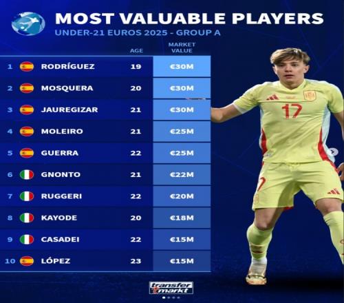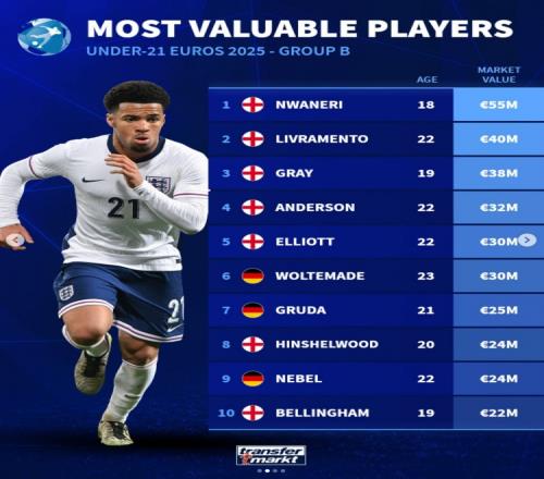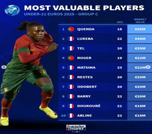 U21欧洲杯身价排行:恩瓦内里5500万欧居首,昆达4500万欧第二