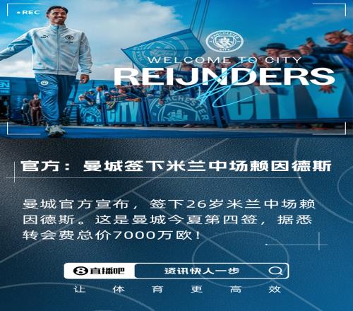 转会费总价7000万欧!官方:曼城签下26岁米兰中场赖因德斯