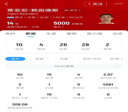 赖因德斯现年26岁,荷兰国籍,在场上主要司职中场,上赛季代表AC米兰出战54场比赛,贡献15粒进球和4次助攻。目前赖因德斯的德转身价为5000万欧元。