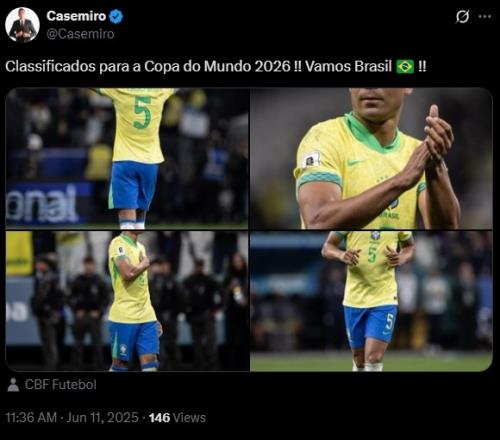 体育资讯6月11日报道宣称 今天,巴西在世预赛1-0击败巴拉圭,晋级2026年世界杯决赛圈,赛后,卡塞米罗在社交媒体发文庆祝。