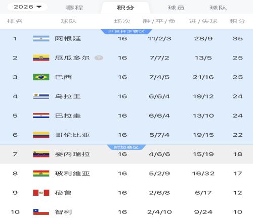 体育资讯06月11日报道宣称 2026世界杯预选赛南美区第16轮,秘鲁0-0厄瓜多尔。厄瓜多尔提前两轮直通世界杯!成为南美第三支晋级队伍。