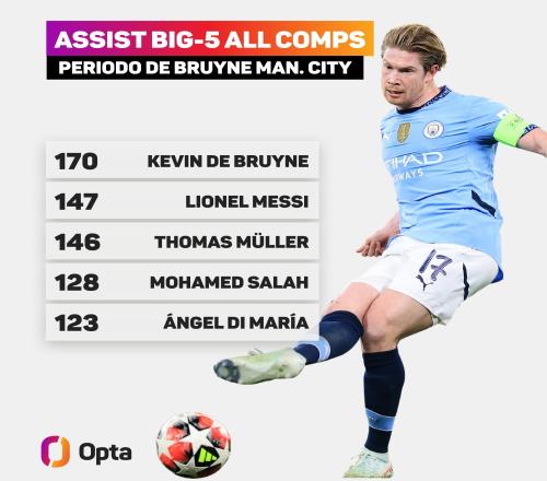 数据统计显示,自2015年8月德布劳内加盟曼城算起,整个欧洲五大联赛送出助攻最多的球员是德布劳内,他在为曼城效力的422场比赛中送出170次助攻。