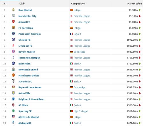 体育资讯06月09日报道宣称 德转最新一期身价更新后,足坛俱乐部身价排名发生变化,最新身价前20的俱乐部如下(单位:欧元):