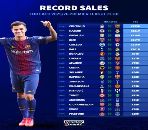 体育资讯6月10日报道宣称 德国转会市场盘点了2025-26赛季20支英超参赛队伍的历史最贵球员出售纪录,库蒂尼奥的1.35亿欧元至今仍排第一。