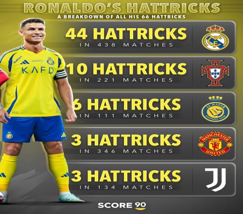 C罗生涯938球分布:皇马时期438场450球占一半,44次戴帽