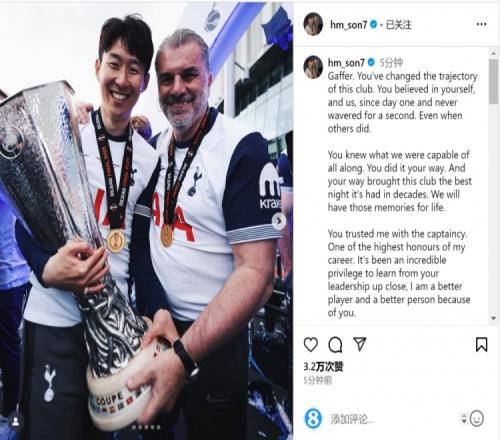 孙兴慜社媒晒出手捧奖杯与波斯特科格鲁的合照,配文:“教练,你改变了这家俱乐部的发展轨迹。从第一天起你就相信自己,也相信我们,从未动摇片刻,即使其他人有所怀疑。你一直知道我们具备的潜力。你以自己的方式行事,为俱乐部带来了几十年来最辉煌的夜晚,这些记忆将伴随我们一生。”