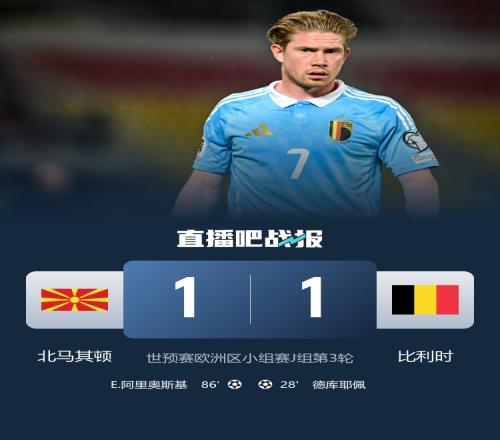 体育资讯06月07日报道宣称 世预赛欧洲区小组赛J组,比利时遭北马其顿1-1绝平。