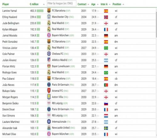 挪威球星哈兰德(2.396亿欧元)和英格兰中场贝林厄姆(2.338亿欧元)分别位列第二位和第三位,紧随其后的是法国球星姆巴佩(1.925亿欧元),他也是top10中年龄最大的球员(26.5岁)。英超在top100球员中占据最多席位(42名球员),其次是西甲(19名),而巴黎圣日耳曼则是top100中入围球员最多的俱乐部,达到了11名。