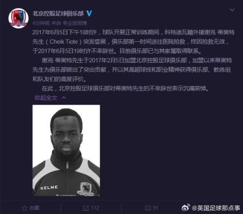 8年前的今天,中甲球队北京北控外援蒂奥特在训练中突发昏厥,第一时间送医抢救但终因抢救无效,于2017年6月5日19时许不幸辞世,年仅30岁。