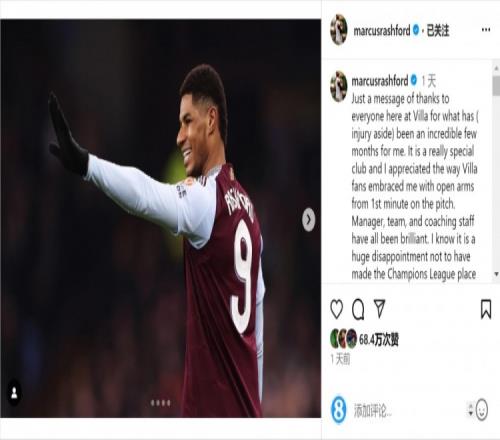 体育资讯5月27日报道宣称 拉什福德更新社媒动态,对维拉表示感谢。