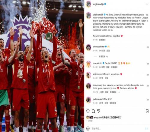 范迪克在个人社媒也晒出与众队友庆祝照片,配文写道:“他的故事,感恩、幸福、荣幸、自豪,作为队长捧起英超冠军奖杯后,我的脑海里涌现出无数的词语。五年内第二次赢得英超冠军是一种幸福。感谢我的家人,感谢球队背后的团队,感谢队友、工作人员,当然还有我们的球迷们!这对我们来说是一个不可思议的赛季。 现在,让我们一起庆祝吧!”