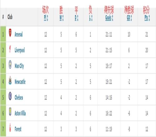 各支强队彼此之间战绩如何?本文将英超冠军利物浦和亚军阿森纳加入争五5队,列出英超前7之间的相互战绩排行。此排行阿森纳居首,利物浦次席,曼城纽卡切尔西维拉森林依次排开。