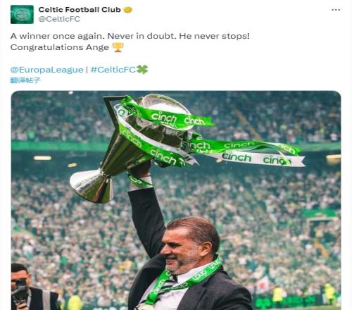 赛后凯尔特人俱乐部更新社媒,向热刺主帅波斯特科格鲁送上祝福。凯尔特人俱乐部写道:“你再次率队成为最后的赢家。从未怀疑,他永不停歇!祝贺你,安格!”