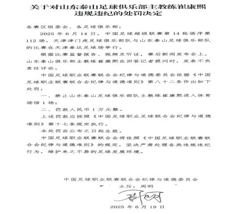 体育资讯06月19日报道宣称 中足联官方消息,泰山主帅崔康熙在津门虎vs泰山赛后发布会上发表不负责任评论,禁止他进入体育场馆1场,罚款1万元。