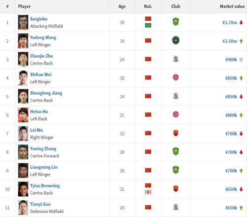 中国球员最新身价前十:仅塞鸟、王钰栋破百万欧,武磊70万欧第7