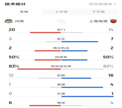河南13海港数据:射门2014,射正37,控球率50%50%