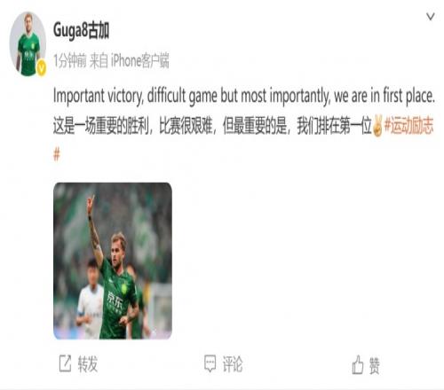 赛后,古加更新社媒庆祝球队赢球,他配文写道:这是一场重要的胜利,比赛很艰难,但最重要的是,我们排在第一位。