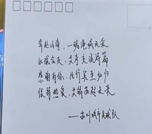 比赛结束后,队员们将更衣室收拾得干干净净。队员们还给连云港留下了一封手写的感谢信:感谢有你,共铸“苏超”未来!