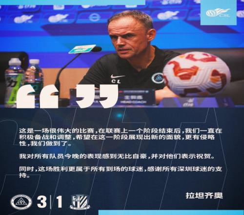 赛后新闻发布会上,主教练克里斯蒂安-拉坦齐奥表示:“我对所有队员今晚的表现感到无比自豪,并对他们表示祝贺。同时,这场胜利更属于所有到场的球迷,感谢所有深圳球迷的支持。”