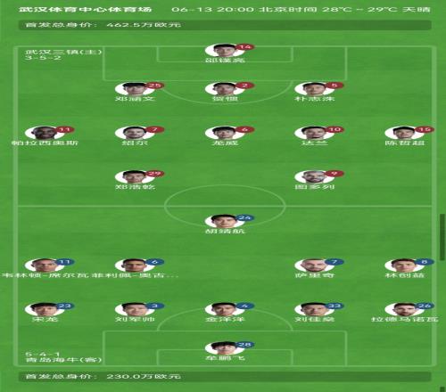 体育资讯06月13日报道宣称 北京时间20点,中超第14轮,武汉三镇主场迎战青岛海牛。赛前,双方首发出炉。