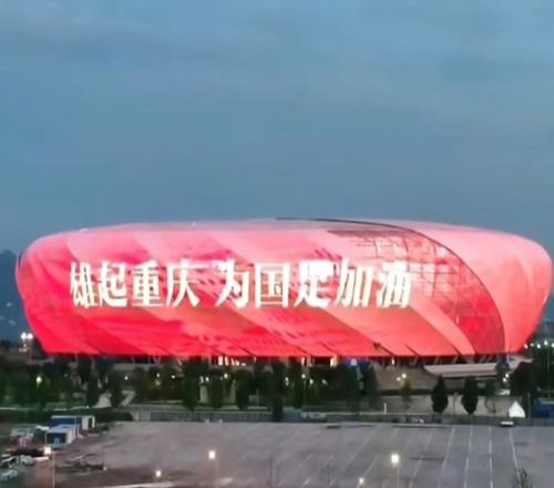 重庆市两江新区管委会透露,龙兴足球场及周边区域现已完成各项筹备工作,全力营造浓厚氛围,龙兴足球场的外立面也打出了“雄起重庆 为国足加油”的巨型字幕,龙兴足球场的外立面有46万颗灯珠,夜幕降临时整个外立面可以变成8万平方米的LED显示屏。