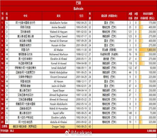 巴林则是派出了平均年龄高达30.2岁的23人名单,效力于黄潜U17的小将赛义德-瓦代伊并未入选,参加了首循环与国足比赛的尼日利亚归化文森特-伊曼纽尔则在名单中。