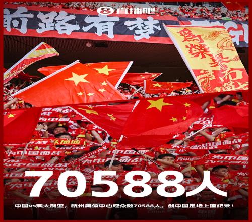 体育资讯6月10日报道宣称 2025年3月25日国足在杭州主场0-2不敌澳大利亚,据现场播报,本场现场观众人数达到70588人,打破中国足坛历史上座纪录。