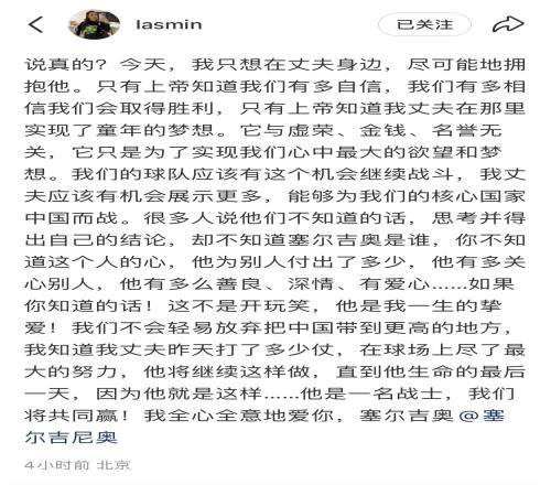 我们不会轻易放弃把中国带到更高的地方,我知道我丈夫昨天打了多少仗,在球场上尽了最大的努力,他将继续这样做,直到他生命的最后一天,因为他就是这样……他是一名战士,我们将共同赢!我全心全意地爱你,塞尔吉奥@塞尔吉尼奥。”