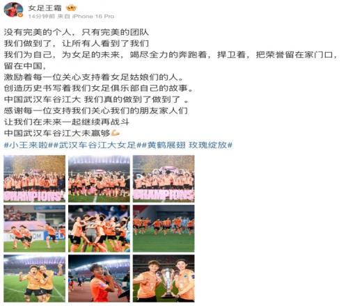 王霜社媒庆祝:没有完美的个人只有完美的团队,武汉女足未赢够!