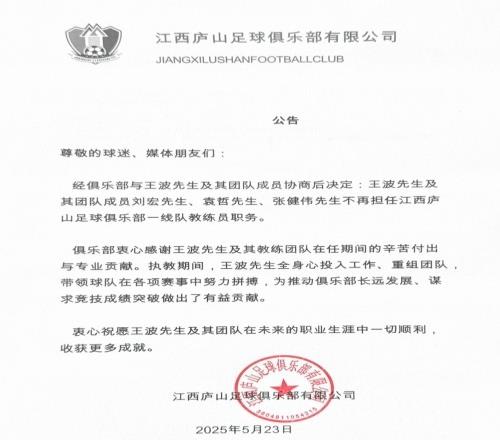 经俱乐部与王波先生及其团队成员协商后决定:王波先生及其团队成员刘宏先生、袁哲先生、张健伟先生不再担任江西庐山足球俱乐部一线队教练员职务。