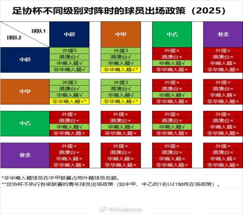 朱艺发足协杯不同级别对阵球员出场政策:中甲及以上对阵可上外援