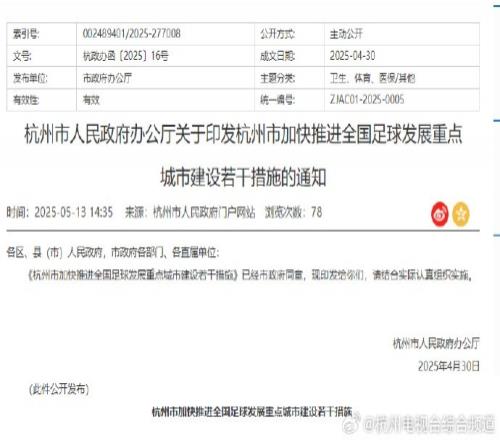 5月13日,《杭州市加快推进全国足球发展重点城市建设若干措施》正式印发,将于2025年6月1日起正式实施。