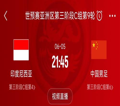 世预赛亚洲区18强赛C组第9轮,印尼队主场对阵中国队,这场比赛定于北京时间6月5日21点45分开球。前8轮,中国男足2胜6负积6分,排名小组垫底。