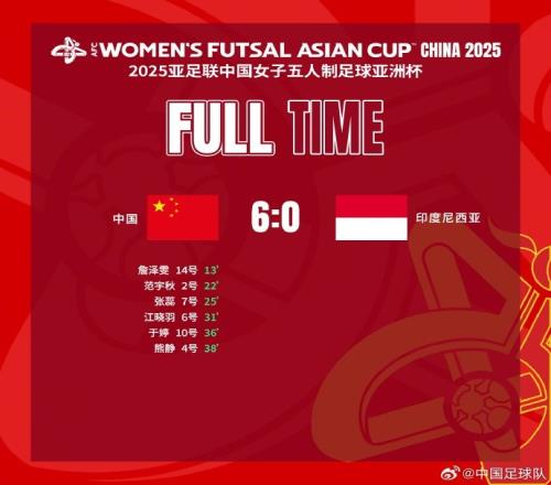 在刚刚结束的2025亚足联中国女子五人制足球亚洲杯1/4决赛中,中国队6比0战胜印度尼西亚队,顺利晋级四强!